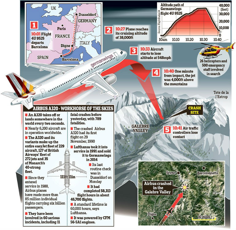Το αεροπλάνο χάθηκε από τα γαλλικά ραντάρ στις 10.53 και ενώ βρισκόταν σε ύψος 6.000 ποδών. Συνετρίβη γύρω στις 11.00 σε απομονωμένη περιοχή κοντά στην πόλη Digne των γαλλικών Άλπεων.