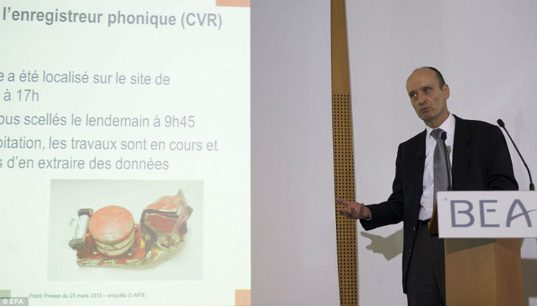 «Έχουμε καταφέρει να εξαγάγουμε ένα αξιοποιήσιμο αρχείο ήχου» δήλωσε ο Rémi Jouty, διευθυντής του Γραφείου Ερευνών και Αναλύσεων, υπεύθυνος των αεροπορικών ατυχημάτων στη Γαλλία. Ωστόσο, «είναι πολύ νωρίς για να εξαχθούν συμπεράσματα σχετικά με το τι συνέβη» πρόσθεσε, κατά τη διάρκεια συνέντευξης Τύπου, αργά το απόγευμα της Τετάρτης.