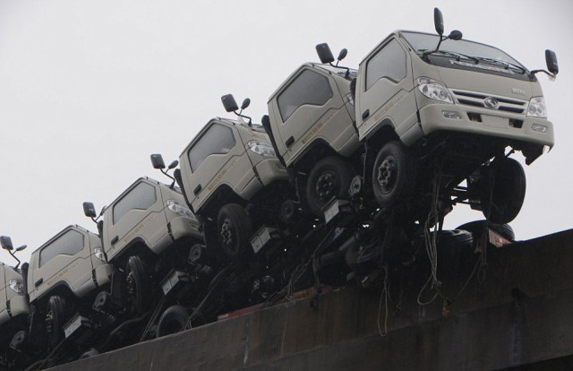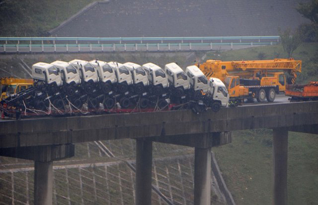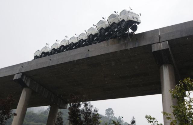 Μια νταλίκα φορτωμένη με δέκα, ολοκαίνουρια φορτηγά σταμάτησε στην άκρη μιας γέφυρας, λίγο προτού κάνουν όλα μια… μια βουτιά στο κενό!