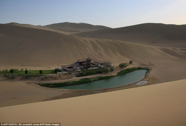Η μικρή όαση εδράζει 6 χλμ. νοτίως της πόλης Dunhuang στη βορειοδυτική Κίνα και κοσμείται από τη λίμνη Yueyaquan που έχει σχήμα μισοφέγγαρου.