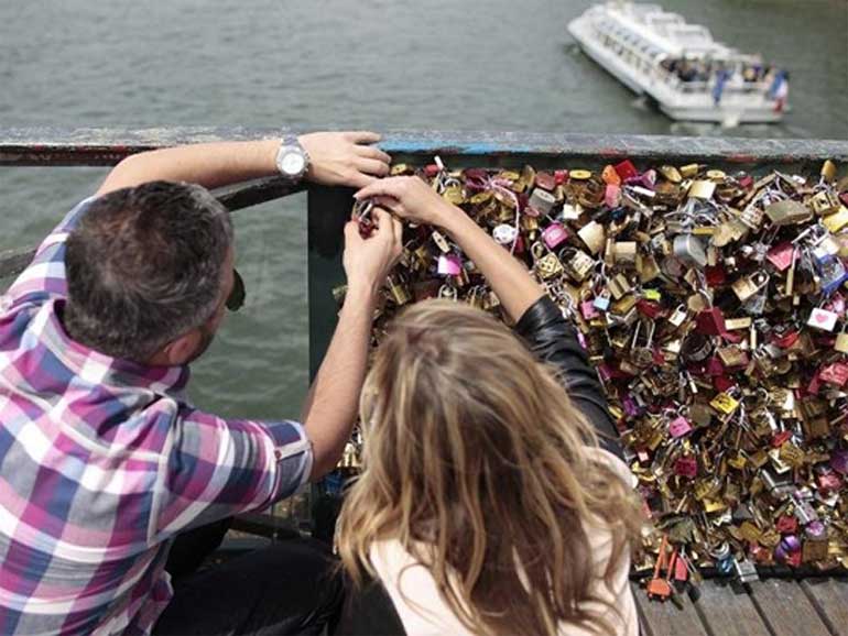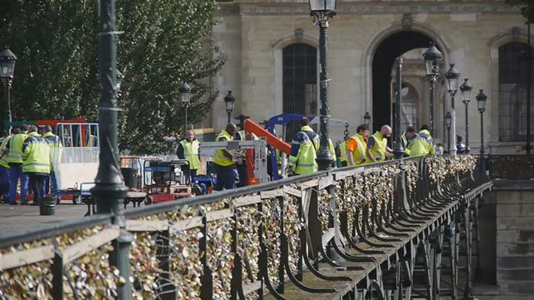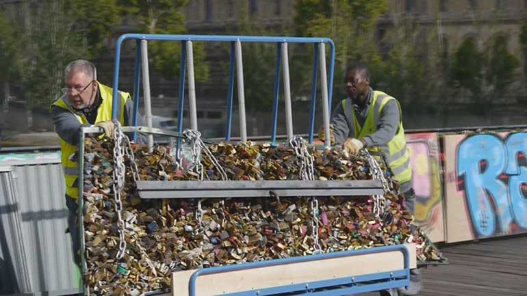 Η υποχώρηση ενός κιγκλιδώματος πέρυσι οδήγησε την δημοτική αρχή της γαλλικής πρωτεύουσας στην απόφαση να «ξεκλειδώσει» τα λουκέτα της παντοτινής αφοσίωσης που ζυγίζουν 45 τόνους. Η απομάκρυνση των περίπου ενός εκατομμυρίου λουκέτων που είχαν τοποθετήσει οι ερωτευμένοι ξεκίνησε από το πρωί της Δευτέρας.
