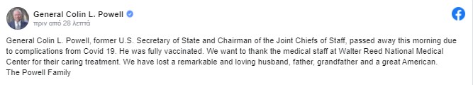Ο στρατηγός Κόλιν Πάουελ, πρώην υπουργός Εξωτερικών των ΗΠΑ υπό τον πρόεδρο Τζορτζ Γ. Μπους και πρώην αρχηγός του γενικού επιτελείου των αμερικανικών Ενόπλων Δυνάμεων, πέθανε εξαιτίας επιπλοκών της Covid-19, ανακοίνωσε, μέσω του Facebook, η οικογένειά του.
