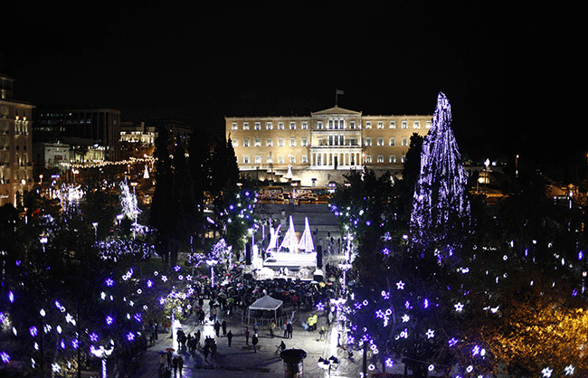 Η Αθήνα ξεκίνησε τις εορταστικές εκδηλώσεις στις 3 Δεκεμβρίου και η έναρξή τους κορυφώθηκε στις 10 του μήνα, όταν ο δήμαρχος Αθηναίων Γιώργος Καμίνης έδωσε το σήμα για τη φωταγώγηση της πλατείας Συντάγματος. Αυτή τη χρονιά το κέντρο της μεγαλύτερης πλατείας της χώρας το κοσμεί ένα λιτό μικρό καράβι.