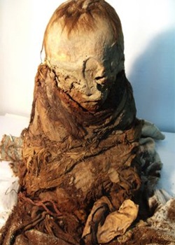 Πρόκειται για το σώμα ενός 2χρονου παιδιού, ύψους 30 εκ. περίπου, το οποίο έχει διατηρηθεί σε άριστη κατάσταση. Ειδικοί που το εξέτασαν, τόνισαν πως δεν μπορούν να προσδιορίσουν το φύλο, υπογραμμίζοντας πως το ένα από τα δύο πόδια είναι μεταγενέστερο, έχοντας τοποθετηθεί το πιθανότερο από αρχαιοκάπηλους σε μια προσπάθεια να αυξηθεί η τιμή πώλησης της μούμιας στη Μαύρη αγορά.
