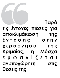 Παρά τις έντονες πιέσεις που ασκούν ηγέτες χωρών της Δύσης για αποκλιμάκωση της έντασης στη χερσόνησο της Κριμαίας, η Μόσχα εμφανίζεται ανυποχώρητη στις θέσεις της.