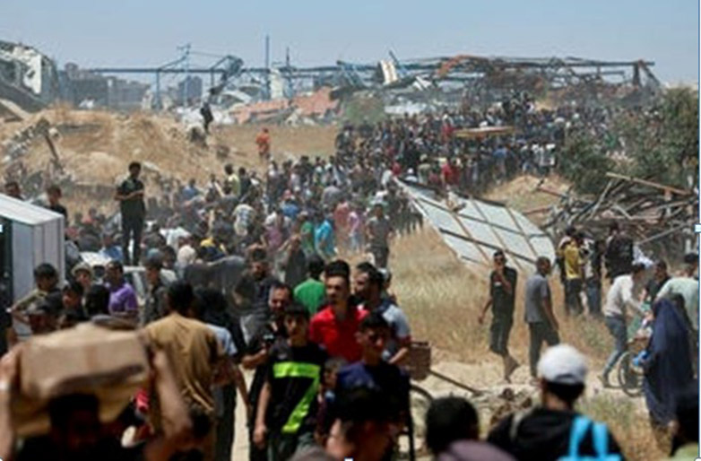 Παλαιστίνιοι συνωστίζονται για να πάρουν προμήθειες βοήθειας από το «Ανθρωπιστικό Ίδρυμα της Γάζας», κοντά στον διάδρομο Netzarim, την Πέμπτη, 29/5. Φωτογραφία: Ramadan Abed/Reuters