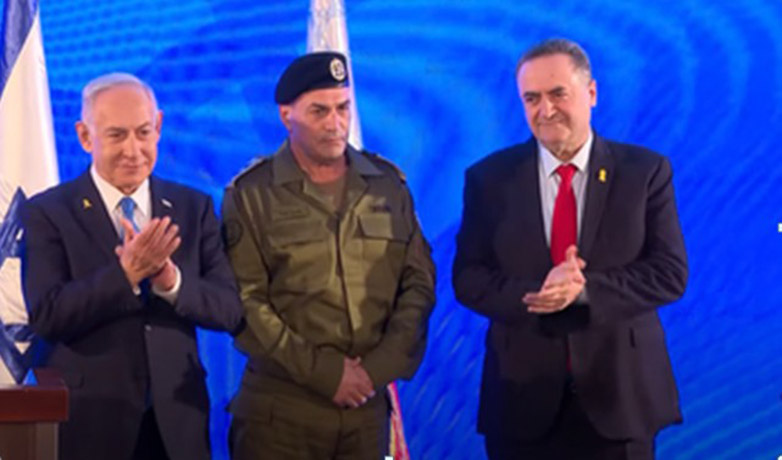 Ο Πρωθυπουργός Μπενιαμίν Νετανιάχου, ο Αντιστράτηγος Εγιάλ Ζαμίρ και ο Υπουργός Άμυνας Ισραήλ Κατζ, στην τελετή της προαγωγής του Ζαμίρ στον ανώτατο βαθμό των Ισραηλινών Αμυντικών Δυνάμεων.