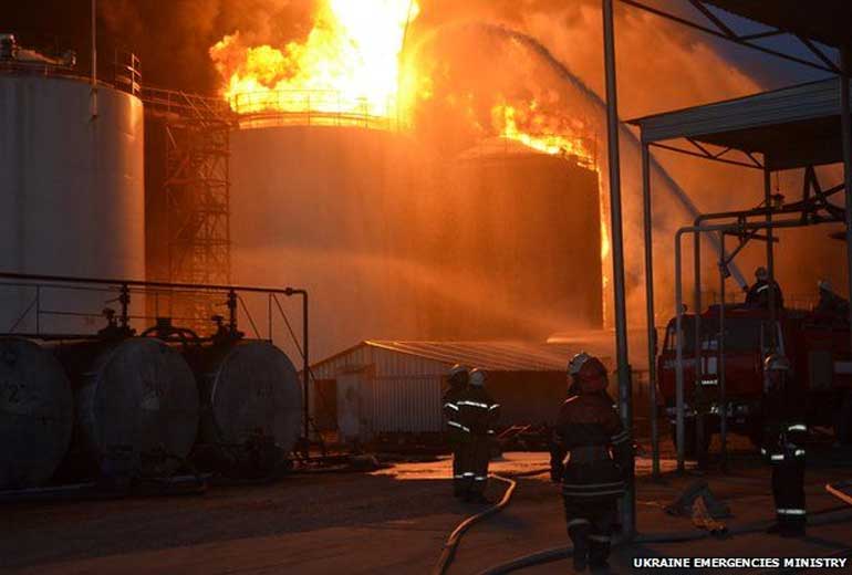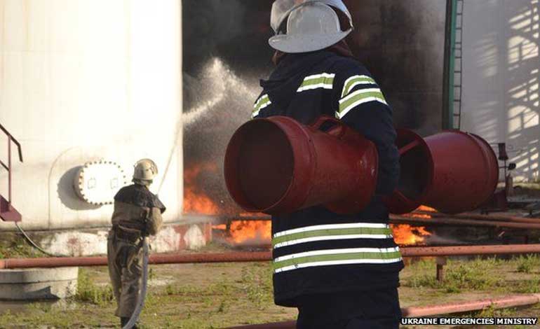 Οι πυροσβεστικές δυνάμεις επιχειρούν να περιορίσουν την έκταση της φωτιάς την ώρα που αγνοείται η τύχη τριών πυροσβεστών. Μέχρι το πρωί η πυρκαγιά είχε επεκταθεί σε τουλάχιστον 16 δεξαμενές, γεμάτες με χιλιάδες γαλόνια βενζίνη, κοντά στο Βασίλκιφ, σε απόσταση 30 χλμ. από την ουκρανική πρωτεύουσα. Τεράστια στήλη καπνού στον ουρανό είναι ορατή από χλμ. μακριά