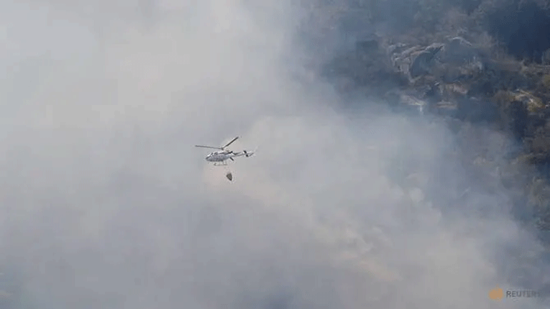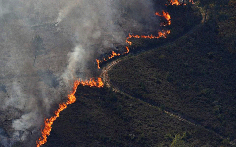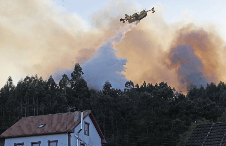 Ελικόπτερα προσπαθούν να κατασβήσουν μια πυρκαγιά σε δάσος κοντά στο χωριουδάκι Γκοντομίλ, στο βορειότερο άκρο της Πορτογαλίας, κοντά στα σύνορα με την Ισπανία. Ένας πυροσβέστης είπε ότι οι επίγειες δυνάμεις περιμένουν να βελτιωθούν οι καιρικές συνθήκες για να επέμβουν.