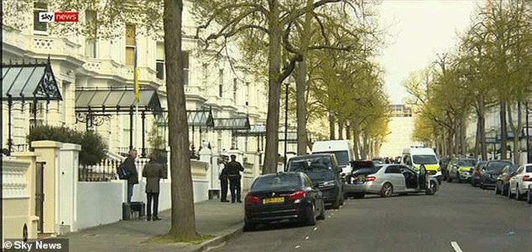 Η αστυνομία εξήγησε σε ένα δελτίο τύπου που εξέδωσε ότι κλήθηκε γύρω στις 08.30 τοπική ώρα (10.30 ώρα Ελλάδας) «για ένα όχημα που συγκρούστηκε με σταθμευμένα οχήματα κοντά στην ουκρανική πρεσβεία», που βρίσκεται στην συνοικία Χόλαντ Παρκ.
