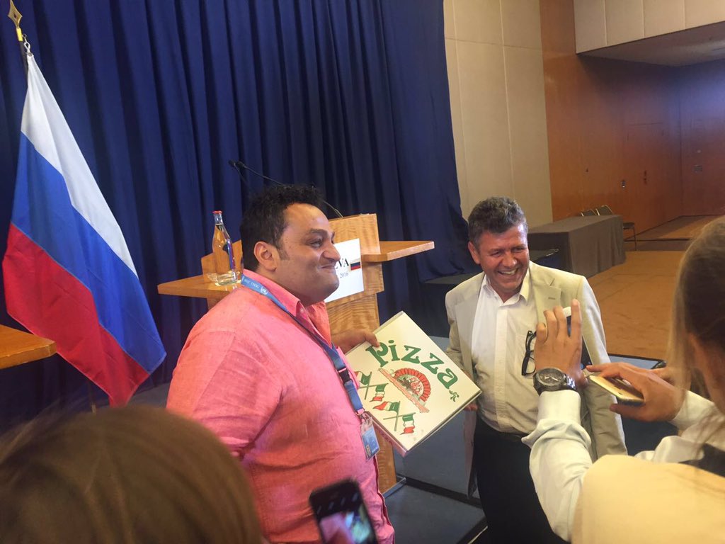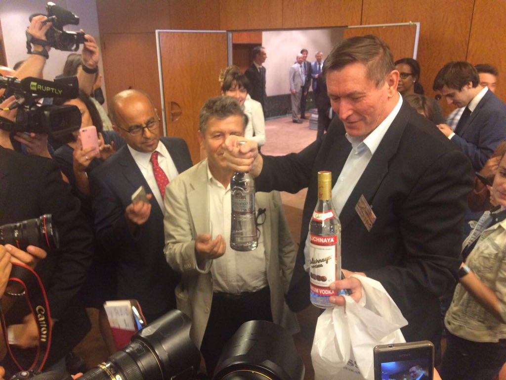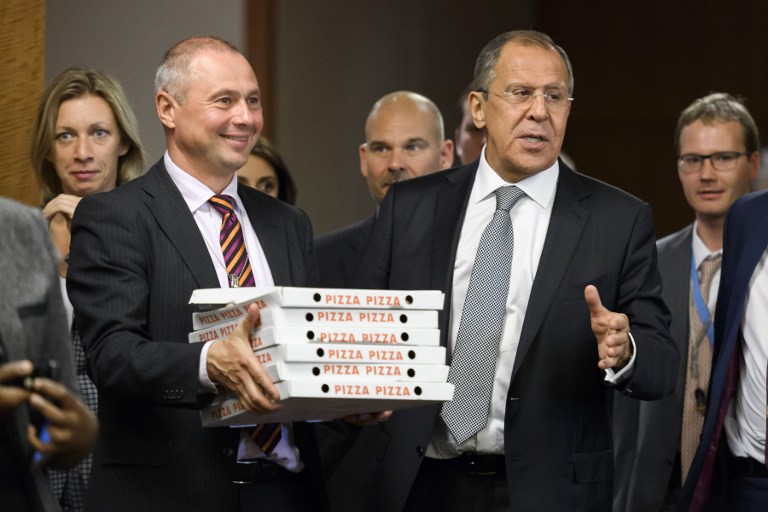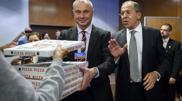 Δώρο «της αμερικανικής αντιπροσωπείας» οι πίτσες, διευκρίνισε ο Ρώσος υπουργός Εξωτερικών και εξαφανίστηκε για να επιστρέψει με δυο μπουκάλια ρώσικη βότκα στα χέρια, όπως ζήτησαν διαπιστευμένοι συμπατριώτες του.