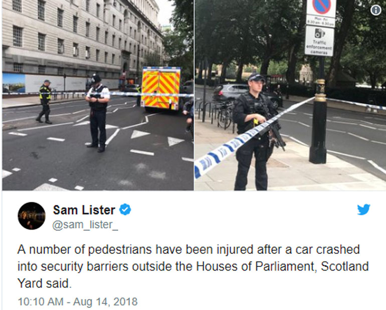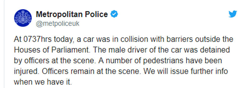 «Η αντιτρομοκρατική υπηρεσία της Μητροπολιτικής Αστυνομίας ερευνά το περιστατικό που έλαβε χώρα σήμερα το πρωί στο Ουέστμινστερ, όπου τραυματίστηκαν άνθρωποι. Ένα ασημί Ford Fiesta, παρέσυρε πεζούς και ποδηλάτες, πριν προσκρούσει στις μπάρες έξω από το Κοινοβούλιο. Ο οδηγός του αυτοκινήτου, ένας άνδρας 20-30 ετών συνελήφθη από ένοπλους αστυνομικούς και οδηγήθηκε στο αστυνομικό τμήμα του νότιου Λονδίνου, όπου κρατείται, ως ύποπτος τρομοκρατικής ενέργειας», επισημαίνει η αστυνομία.