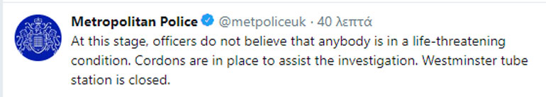 «Σε αυτό το στάδιο, οι αστυνομικοί δεν θεωρούν ότι η ζωή κάποιου από τους τραυματίες βρίσκεται σε κίνδυνο. Η περιοχή έχει αποκλεισθεί για να διευκολυνθούν οι έρευνες. Ο σταθμός Γουέστμινστερ του μετρό είναι κλειστός», γράφει η Μητροπολιτική Αστυνομία στον λογαριασμό της στο Twitter.