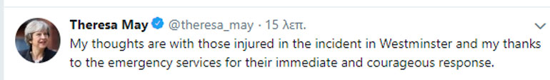 Η πρωθυπουργός Τερέζα Μέι έστειλε μέσω του Twitter την σκέψη της προς τους τραυματίες και ευχαρίστησε τις βρετανικές υπηρεσίες για την άμεση ανταπόκρισή τους.