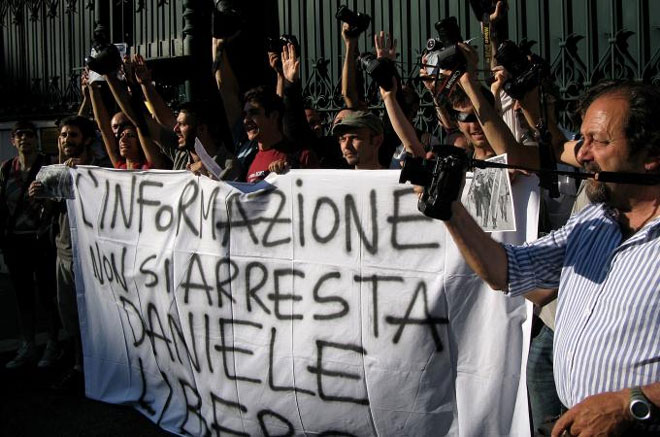 (Μία ομάδα φωτορεπόρτερ κρατούν ένα πανό μπροστά από την πρεσβεία της Τουρκίας στη Ρώμη που αναγράφει: «Δεν μπορείτε να συλλάβετε την ενημέρωση, ελευθερώστε τον Ντάνιελ» – ώρα Ελλάδος: 21.45)