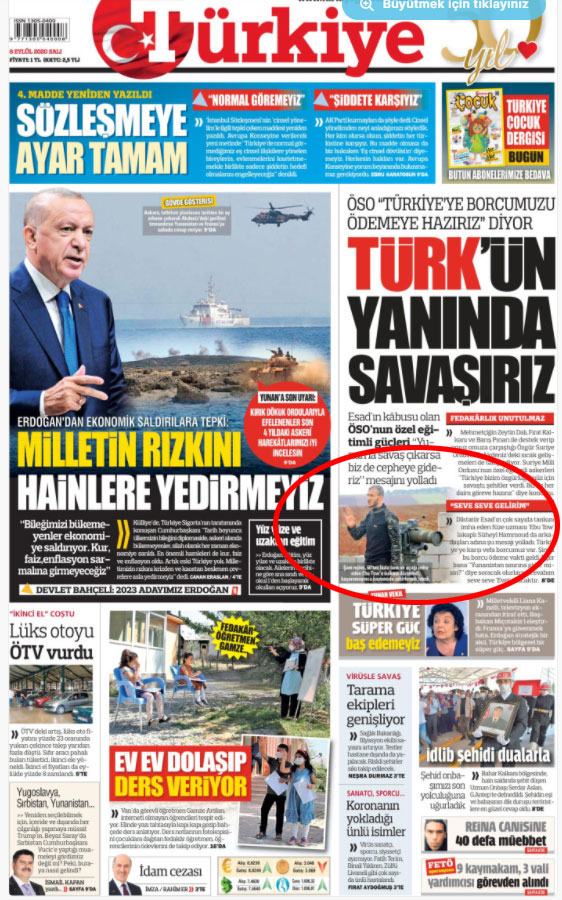 Σήμερα ήταν η σειρά της εφημερίδας Turkiye, η οποία φιλοξενεί δημοσίευμα σύμφωνα με το οποίο, σε περίπτωση πολέμου, Σύροι μισθοφόροι είναι έτοιμοι να πολεμήσουν στο πλευρό της Τουρκίας.