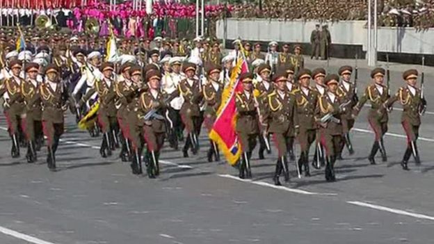 Εντυπωσιακός ήταν ο αριθμός των τανκς, των πυραύλων και των εκτοξευτήρων ρουκετών που έκαναν την εμφάνισή τους στην πλατεία Κιμ Ιλ Σουνγκ, σύμφωνα με τις εικόνες που μετέδωσε απευθείας η κρατική τηλεόραση της χώρας. Αργότερα παρέλασαν επίσης δεκάδες χιλιάδες πολίτες, ανάμεσά τους και μαθητές, που σαν μαζορέτες χόρευαν κι ανέμιζαν χρωματιστά πομ πομ.