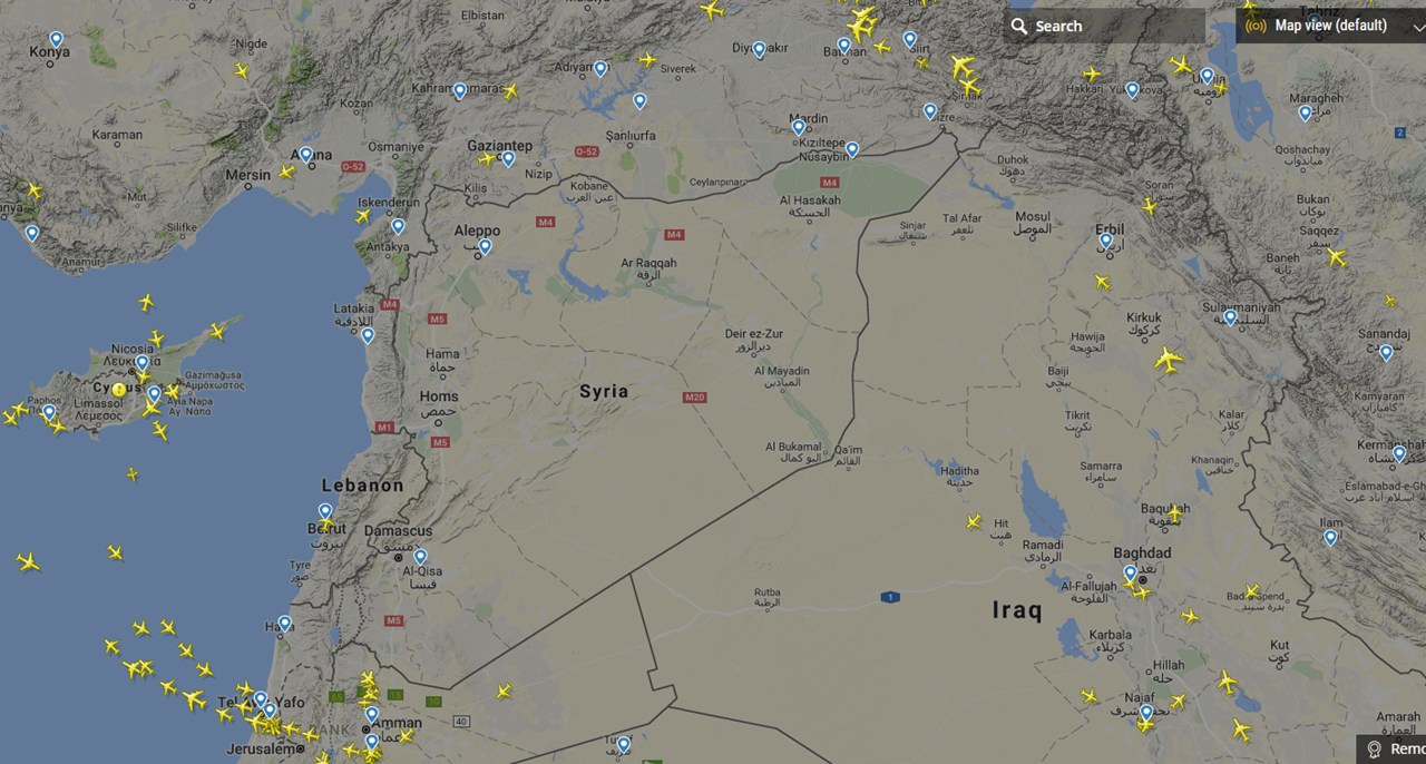Όπως καταδεικνύεται από το Flightradar24, η εναέρια κυκλοφορία στην Ανατολική Μεσόγειο και πάνω από τη Συρία ήταν από τις 11.00 το πρωί της Πέμπτης 12 Απριλίου μηδενική. Κανένα αεροπλάνο, οποιουδήποτε τύπου, δεν πραγματοποιεί πτήσεις πάνω από τη χώρα.