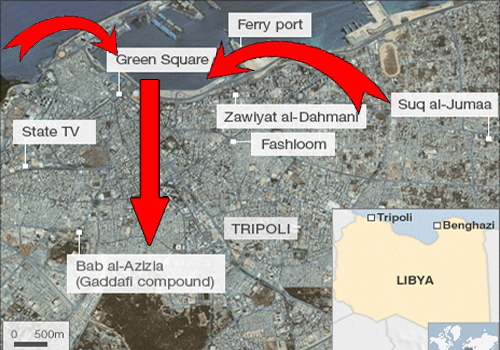 Αμέσως μετά την κατάληψη της Πράσινης Πλατείας τις πρώτες πρωινές ώρες οι αντικαθεστωτικοί ξεκίνησαν την προσεκτική πορεία τους προς το συγκρότημα κατοικιών του Μουάμαρ Καντάφι.