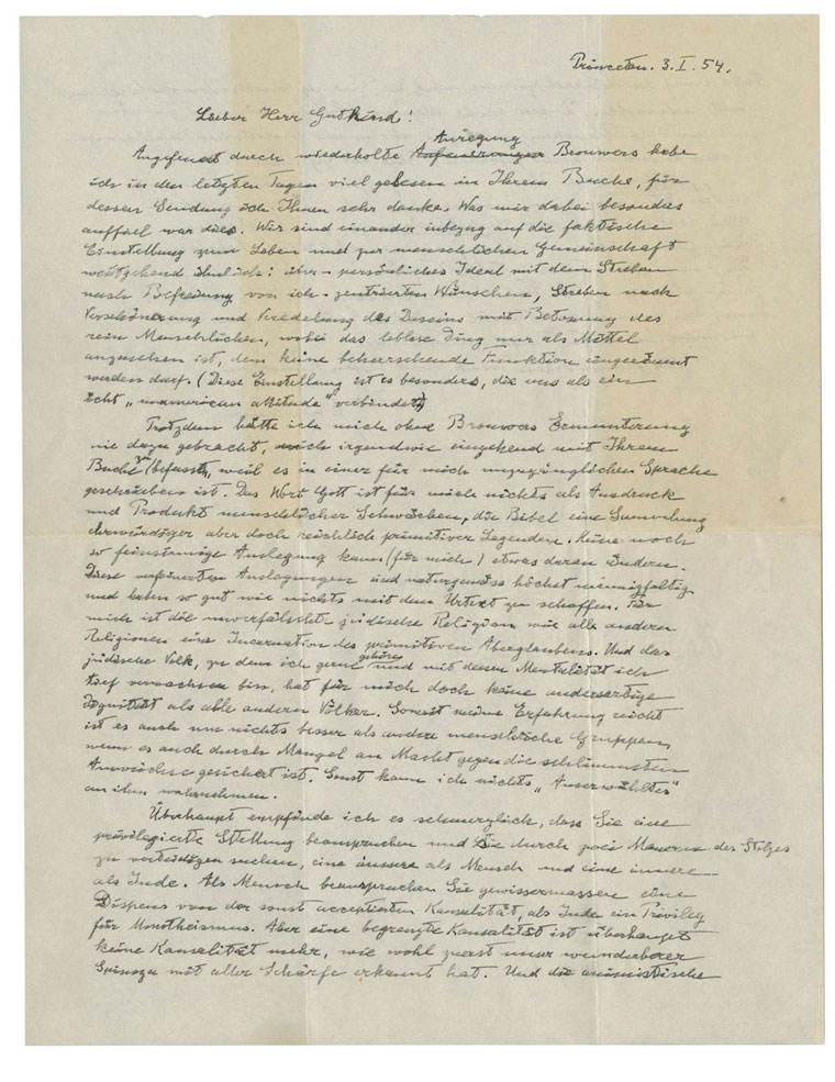 Η επιστολή εκτείνεται σε μιάμιση σελίδα και γράφτηκε την εποχή που ο Αϊνστάιν ζούσε στο Νιου Τζέρσεϊ. Το 2008 το γράμμα πουλήθηκε σε δημοπρασία σε έναν ιδιώτη συλλέκτη έναντι 404.000 δολαρίων.