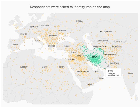 Περίπου το 8% των Αμερικανών πέρασαν το Ιράν για το Ιράκ, ενώ δεν ήταν λίγοι αυτοί που νόμιζαν ότι το Ιράν βρίσκεται στην Ευρώπη, ανάμεσα σε χώρες όπως η Ρουμανία, η Ουκρανία, αλλά και η Ελλάδα.