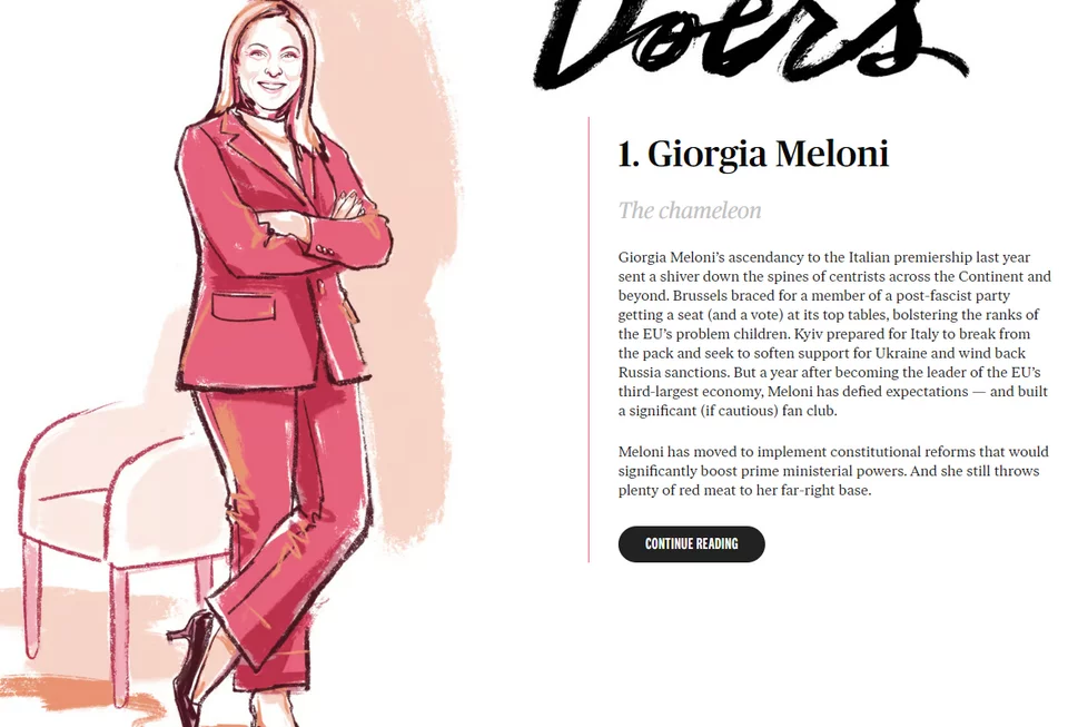 Στην πρώτη θέση είναι η Τζόρτζια Μελόνι. «Η άνοδος της Τζόρτζια Μελόνι στην ιταλική πρωθυπουργία προκάλεσε ανατριχίλα στους κεντρώους σε όλη την ήπειρο και όχι μόνο. Οι Βρυξέλλες ετοιμάζονταν για ένα μέλος ενός μεταφασιστικού κόμματος να πάρει μια θέση (και μια ψήφο), ενισχύοντας τις τάξεις των προβληματικών παιδιών της Ευρωπαϊκής Ενωσης. Η Μελόνι έχει προχωρήσει στην εφαρμογή συνταγματικών μεταρρυθμίσεων που θα ενισχύσουν σημαντικά τις εξουσίες του πρωθυπουργού».