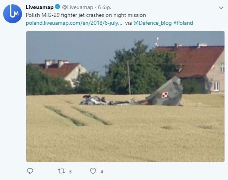Μαχητικό αεροσκάφος MiG-29 των πολωνικών ενόπλων δυνάμεων συνετρίβη στο βόρειο τμήμα της χώρας, ο πιλότος του πέθανε, ανέφερε το Πολωνικό υπουργείο Άμυνας.
