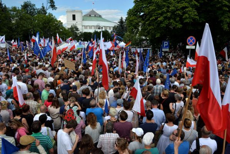 «Ντροπή, ντροπή, ντροπή» φώναζαν οι διαδηλωτές στη Βαρσοβία, κρατώντας σημαίες της Πολωνίας και της Ευρωπαϊκής Ένωσης, και αποκαλώντας τον πρόεδρο του PiS και εκ των πραγμάτων ηγέτη της χώρας Γιάροσλαβ Κατσίνσκι “δικτάτορα”.