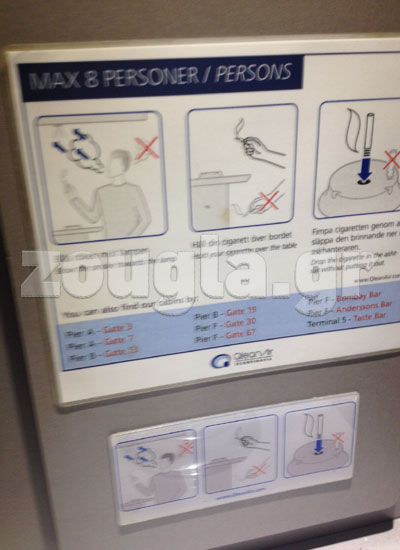 Στο αεροδρόμιο της Στοκχόλμης στη Σουηδία, κατασκευάστηκε μια μικρή αίθουσα, 3 μέτρα επί 1, στη μέση ακριβώς του κεντρικού διαδρόμου, όπου μέχρι οχτώ «θεριακλήδες» συνωστίζονται (ευτυχώς αξιοποιούνται σύγχρονα συστήματα εξαερισμού) και φυσικά γίνονται… θέαμα, για τους εκατοντάδες περαστικούς…