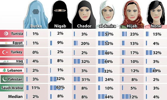 Μία νέα έρευνα του Ινστιτούτου κοινωνικής έρευνας του Πανεπιστημίου του Michigan φανερώνει τον τρόπο με τον οποίο ντύνονται οι γυναίκες σε μουσουλμανικές χώρες, όπως η Τυνησία, η Αίγυπτος, η Τουρκία, το Ιράκ, ο Λίβανος, το Πακιστάν και η Σαουδική Αραβία.