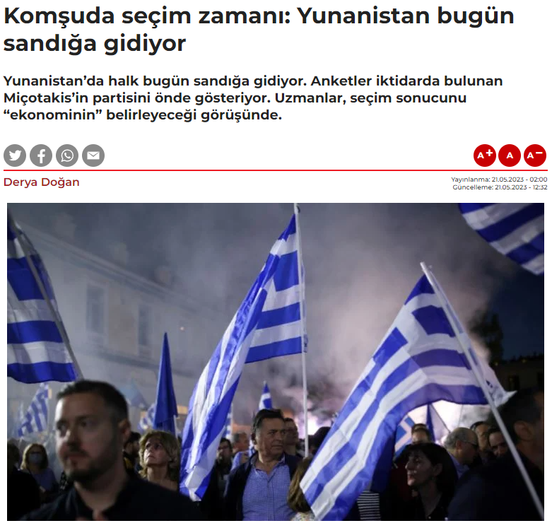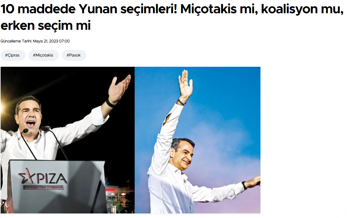 Μια αμφίρροπη εκλογική αναμέτρηση προβλέπουν τα τουρκικά ΜΜΕ, στις αναφορές τους για τις σημερινές (21/5) εκλογές που διεξάγονται στη χώρα μας. Η Hurriyet τιτλοφορεί το βασικό της άρθρο για τις ελληνικές εκλογές ως εξής: «Μητσοτάκης, συνασπισμός ή πρόωρες εκλογές;», με τον αρθρογράφο να χαρακτηρίζει στον πρόλογό του την προεκλογική περίοδο στη χώρα μας «βαρετή», ενώ δηλώνει με βεβαιότητα ότι με το σύστημα της απλής αναλογικής, κανένα πολιτικό κόμμα δεν αναμένεται να σχηματίσει αυτοδύναμη κυβέρνηση από τον πρώτο γύρο.