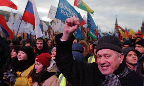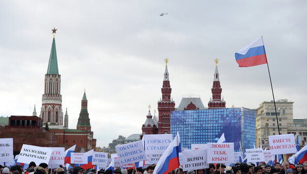 Ο πρόεδρος της Ρωσίας Βλαντίμιρ Πούτιν είπε σε ένα συγκεντρωμένο πλήθος μπροστά στα τείχη του Κρεμλίνου, στην Κόκκινη Πλατεία, ότι η Κριμαία, η Αυτόνομη Δημοκρατία της Ουκρανίας, επιτέλους επιστρέφει εκεί όπου ανήκει. «Η Κριμαία και η Σεβαστούπολη επιστρέφουν στις… δικές τους ακτές, στη βάση τους, στη Ρωσία!», είπε ο Πούτιν απευθυνόμενος σε ένα πλήθος που φώναζε ρυθμικά «Ρωσία!» και «Πούτιν!» λίγη ώρα αφότου υπέγραψε ένα κείμενο με το οποίο η χερσόνησος αυτή της Μαύρης Θάλασσας εντάσσεται στη Ρωσική Ομοσπονδία.