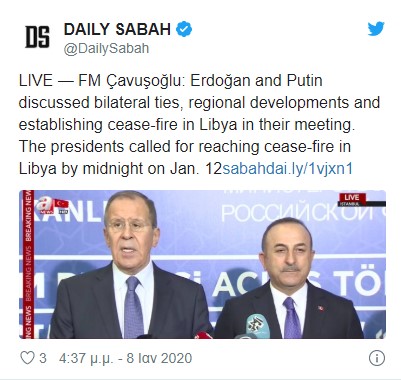 Από την πλευρά του, ο Ρώσος υπουργός Εξωτερικών Σεργκέι Λαβρόφ δήλωσε ότι Πούτιν και Ερντογάν υιοθετούν κοινή στάση στο ζήτημα της εξομάλυνσης της κατάστασης στη Λιβύη.
