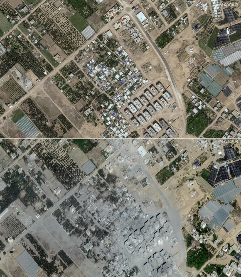 Οι δορυφορικές εικόνες που έδωσε στη δημοσιότητα η Maxar Technologies αποκαλύπτουν το πραγματικό μέγεθος της καταστροφής. Σπίτια, επιχειρήσεις και λοιπές δομές έχουν μετατραπεί σε ερείπια. Οι περιουσίες εκατομμυρίων Παλαιστινίων έγιναν σκόνη. Χιλιάδες ζωές χάθηκαν. Εκατομμύρια άμαχοι εξαρτώνται από την ανθρωπιστική βοήθεια που εισέρχεται με το σταγονόμετρο από το πέρασμα της Ράφα.