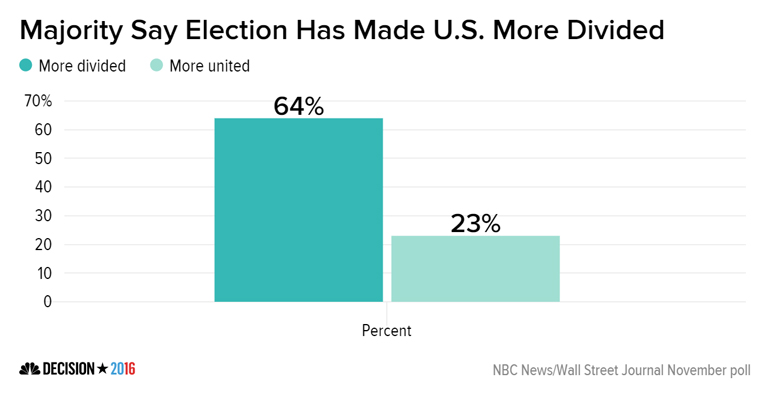 Εξήντα τέσσερα τοις εκατό των πιθανών ψηφοφόρων, αναφέρουν ότι η εκλογή του επόμενου Προέδρου, έχει κάνει το έθνος πιο διαιρεμένο, έναντι 23 τοις εκατό, που θεωρούν ότι το έκανε πιο ενωμένο.