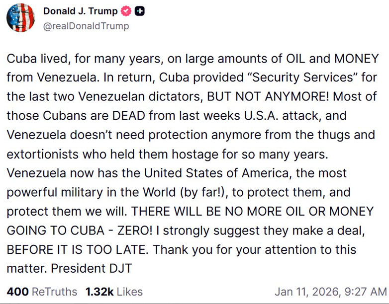 «ΔΕΝ ΘΑ ΥΠΑΡΞΕΙ ΑΛΛΟ ΠΕΤΡΕΛΑΙΟ Ή ΧΡΗΜΑΤΑ ΠΟΥ ΘΑ ΠΗΓΑΙΝΟΥΝ ΣΤΗΝ ΚΟΥΒΑ – ΜΗΔΕΝ! Προτείνω ανεπιφύλακτα ότι θα κάνουν μία συμφωνία, ΠΡΙΝ ΕΙΝΑΙ ΠΟΛΥ ΑΡΓΑ», έγραψε ο Τραμπ στην πλατφόρμα κοινωνικής δικτύωσης του, Truth Social.
