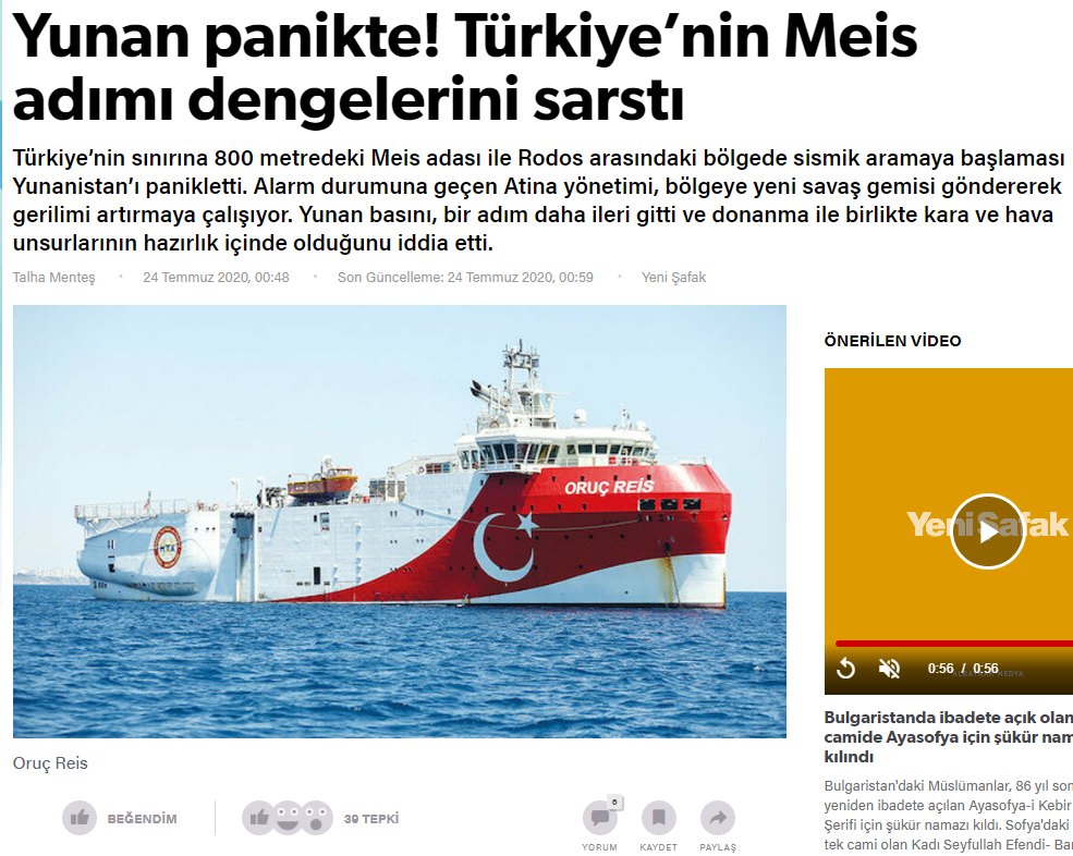 Σε δημοσίευμά της η Yeni Safak, αναφέρει πως η Ελλάδα βρίσκεται σε πανικό μετά την έκδοση της τουρκικής Navtex, ενώ η διοίκηση της Αθήνας βρίσκεται σε εγρήγορση, προσπαθώντας να αυξήσει την ένταση στέλνοντας νέο πολεμικό πλοίο στην γύρω περιοχή.