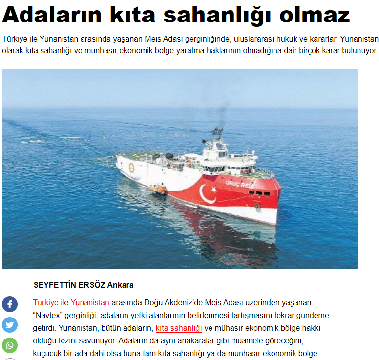 Την ίδια ώρα, δημοσίευμα του δημοσιογράφου Seyfettin Ersöz στην εφημερίδα Milliyet φέρει τον τίτλο «Συνεχώς τα ίδια ψέματα», σημειώνει ότι το διεθνές δίκαιο και το νομικό προηγούμενο «καταρρίπτει» τις θέσεις των Ελλήνων, καθώς υπάρχουν «πολλές προηγούμενες αποφάσεις» του Διεθνούς Δικαστηρίου της Χάγης που ορίζουν ότι τα νησιά «δεν δημιουργούν υφαλοκρηπίδα και ΑΟΖ».