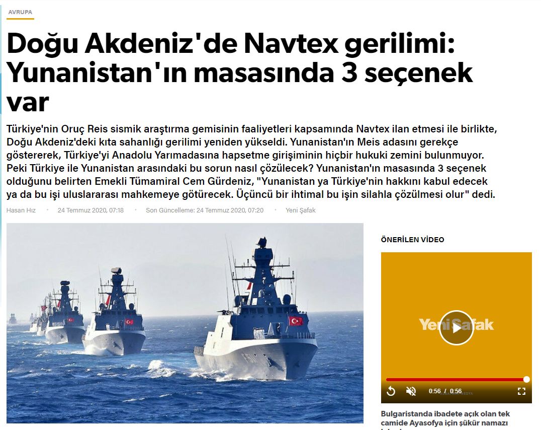 Άρθρο του Hasan Hiz στην ηλεκτρονική έκδοση της τουρκικής εφημερίδας Yeni Şafak με τίτλο «Ένταση με Navtex στην Ανατολική Μεσόγειο: Η Ελλάδα έχει 3 επιλογές στο τραπέζι» φιλοξενεί σχόλια του αντιναύαρχου Cem Gürdeniz.