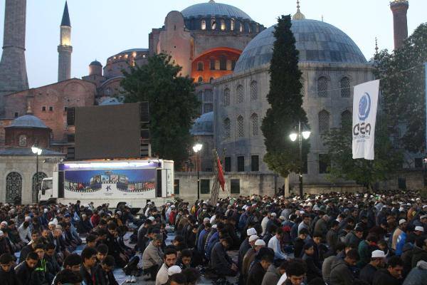 Χιλιάδες μουσουλμάνοι ανταποκρίθηκαν, και προσευχήθηκαν στις 4 τα ξημερώματα στον περίβολο έξω από την Αγιά Σοφιά (ξεχωριστά οι άντρες και οι γυναίκες), φωνάζοντας παράλληλα συνθήματα όπως «να σπάσουν οι αλυσίδες, να ανοίξει η Αγιά Σοφιά» και «ο Αλλάχ είναι Μεγάλος». Μάλιστα πολλοί ήταν εκείνοι που ταξίδεψαν για αυτό τον σκοπό, καθώς στο μνημείο κατέφθασαν πολλά πούλμαν.