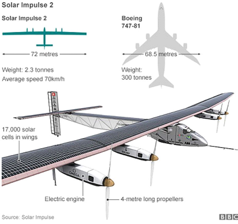 Το Solar Impulse έχει άνοιγμα φτερών 72μέτρα, που είναι το μεγαλύτερο ακόμη και από τα «747 jumbo» αλλά ζυγίζει μόλις 2,3 τόνους.
