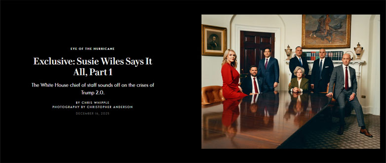 Η Σούζι Γουάιλς, κομβικής σημασίας πρόσωπο στην προεκλογική εκστρατεία και τώρα στην κυβέρνηση, έδωσε σειρά συνεντεύξεων στο αμερικανικό περιοδικό, που αποτελούν το κεντρικό θέμα ενός μακροσκελούς άρθρου αφιερωμένου στον στενό κύκλο του προέδρου.