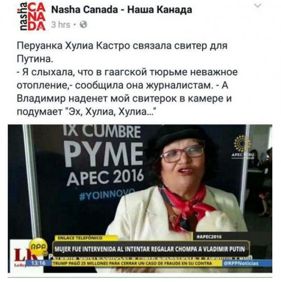 Ένα πουλόβερ, που έφτιαξε η ίδια, θέλησε να χαρίσει μια Περουβιανή σχεδιάστρια στον Ρώσο πρόεδρο Βλαντίμιρ Πούτιν, που παρακολουθούσε τις εργασίες της συνόδου κορυφής του Οργανισμού Οικονομικής Συνεργασίας Ασίας – Ειρηνικού (APEC) στη Λίμα του Περού.