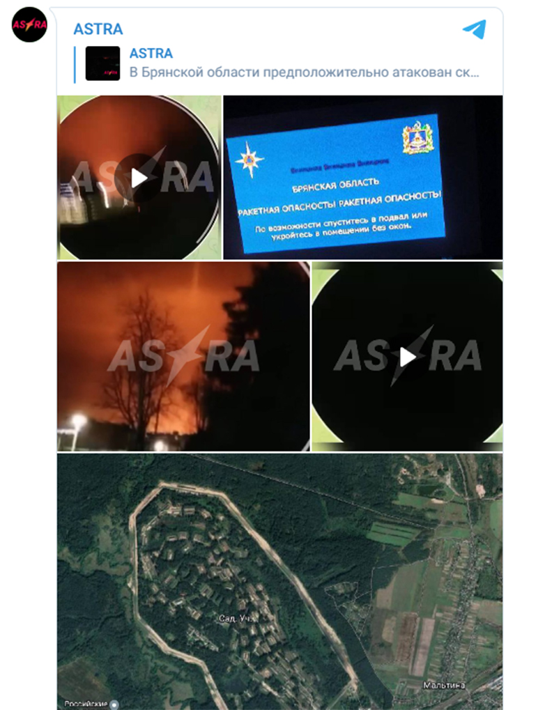Η επίθεση έγινε στο 67ο οπλοστάσιο της κύριας διεύθυνσης πυραύλων και πυροβολικού του ρωσικού υπουργείου Άμυνας. Πλάνα από τα μέσα κοινωνικής δικτύωσης έδειξαν ισχυρές πυρκαγιές στο σημείο.