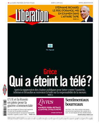 Μέσα στη μαυρίλα είναι το σημερινό πρωτοσέλιδο της γαλλικής εφημερίδας «Libération», το οποίο ασχολείται με το «λουκέτο» στην ΕΡΤ.