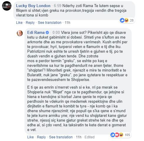 Απευθυνόμενος προς συμπατριώτη του, ο οποίος μέσω Facebook του ζήτησε να δώσει μια απάντηση σε όσα έγιναν στην κηδεία, ο Αλβανός πρωθυπουργός ανέφερε: