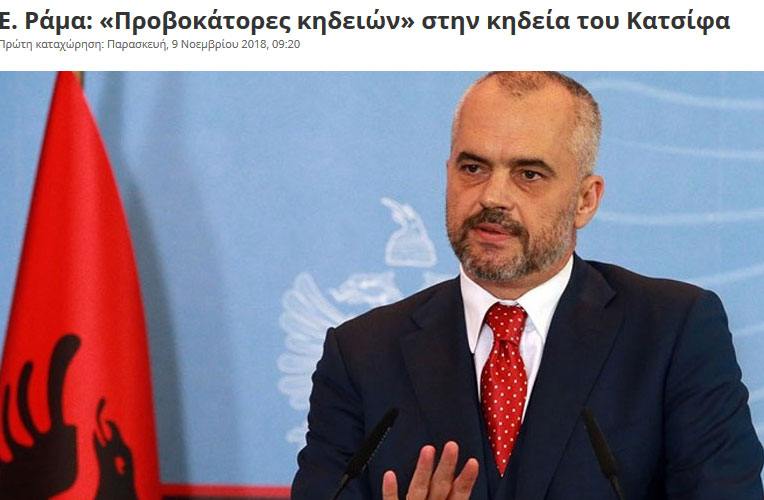 «Προβοκάτορες κηδειών» χαρακτήρισε ο πρωθυπουργός της Αλβανίας Έντι Ράμα όσους παρευρέθησαν στην κηδεία, χθες, του Κωνσταντίνου Κατσίφα στους Βουλιαράτες.