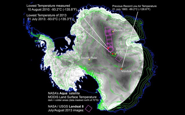 Η θερμοκρασία κατεγράφη στις 10 Αυγούστου του 2010, σε θύλακες αέρα εγκλωβισμένου σε κορυφογραμμή της Ανατολικής Ανταρκτικής, όπως ανακοίνωσαν οι επιστήμονες σε συνέδριο της Αμερικανικής Ένωσης Γεωφυσικών. Μέχρι σήμερα, το ρεκόρ κατείχε ο ρωσικός σταθμός Βοστόκ της Ανταρκτικής, όπου το 1983 κατεγράφη θερμοκρασία – 89,2 βαθμών Κελσίου. «Είμαι βέβαιος πως αυτοί οι θύλακες είναι τα ψυχρότερα σημεία στη Γη» είπε από το βήμα του συνεδρίου ο ερευνητής στο αμερικανικό Εθνικό Κέντρο Δεδομένων για το Χιόνι και τον Πάγο. Συνέκρινε τη θερμοκρασία με αυτήν που θα επικρατούσε «μια όμορφη καλοκαιρινή μέρα στους πόλους του Άρη», λέγοντας πως ο άνθρωπος μπορεί να επιβιώσει σε τέτοιες συνθήκες για περίπου τρία λεπτά, αναπνέοντας ωστόσο με δυσκολία.