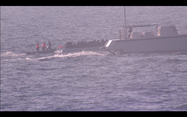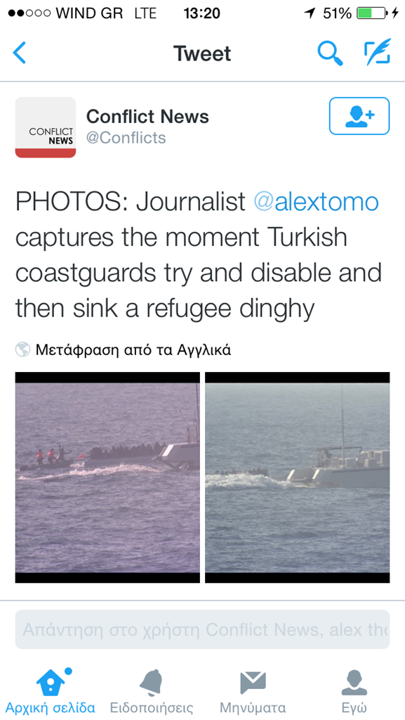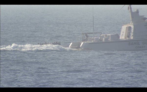 Σύμφωνα με φωτογραφίες του δημοσιογράφου Alex Thomson (για λογαριασμό του Channel 4), που αναρτήθηκαν στο Twitter, Τούρκοι λιμενικοί επιχειρούν να βυθίσουν μια βάρκα με μετανάστες, προκαλώντας κυματισμό με το σκάφος τους.