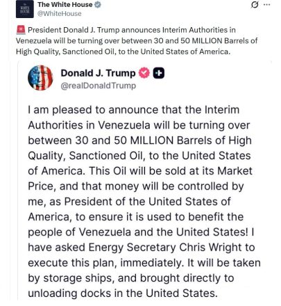 Σε συμφωνία για εξαγωγή αργού πετρελαίου αξίας έως και 2 δισ. δολάρια προς τις ΗΠΑ κατέληξαν το Καράκας και η Ουάσινγκτον, όπως αποκαλύπετι το Reuters. Aποτέλεσμα ήταν οι παγκόσμιες τιμές του πετρελαίου να υποχώρησαν την Τετάρτη 07/01 και η Κίνα να κατηγορήσει τις ΗΠΑ ότι παίζουν τον ρόλο του διεθνούς νταή, αφού η κυβέρνηση του προέδρου Ντόναλντ Τραμπ δήλωσε ότι έπεισε τη Βενεζουέλα να εκτρέψει τις προμήθειές της από το Πεκίνο και να της παραδώσει αργό πετρέλαιο αξίας έως και 2 δισεκατομμυρίων δολαρίων, το οποίο είχε τεθεί υπό εμπάργκο.